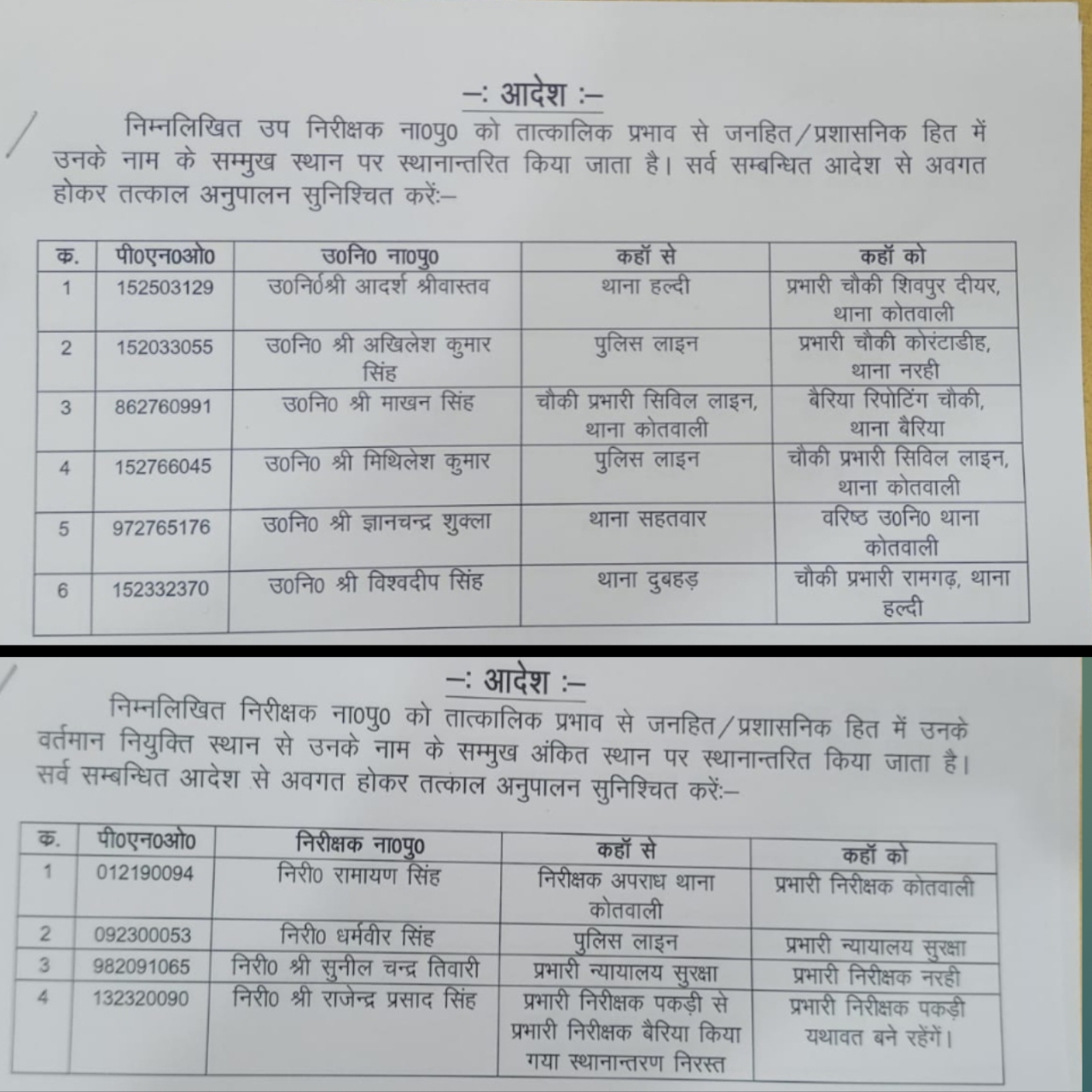 चौकी प्रभारी सिविल लाइन,उप निरीक्षक ग्यान चन्द्र शुक्ला को थाना सहतवार से वरिष्ठ उपनिरीक्षक थाना कोतवाली और उप निरीक्षक विश्वदीप सिंह को थाना दुबहर से चौकी प्रभारी रामगढ (थाना )हल्दी स्थानानतरित किया गया है।