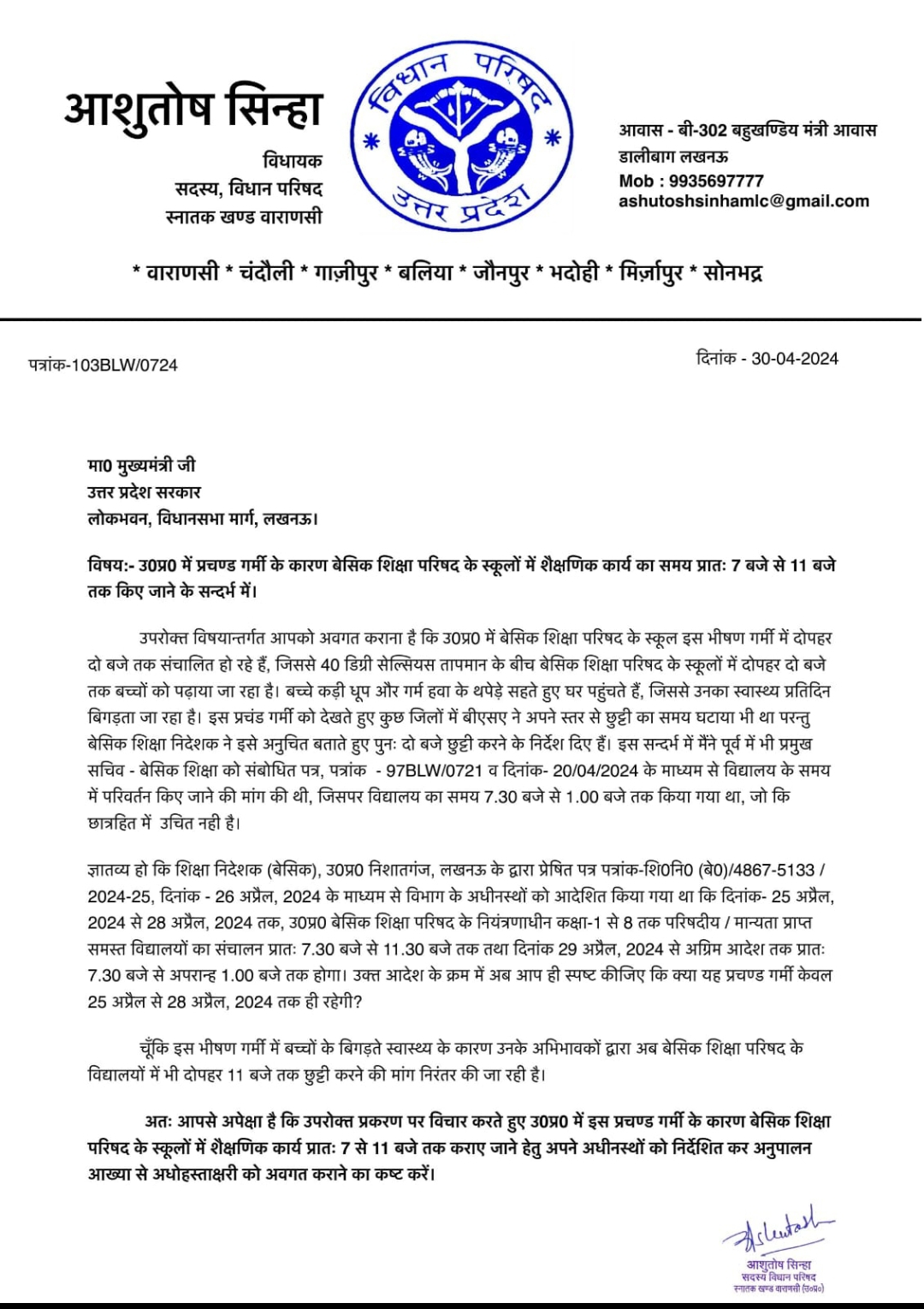 : भीषण गर्मी में झुलस रहे नन्हें-मुन्ने बच्चों के लिए स्कूल संचालन का समय 7 से 11 तक किए जाने हेतु मुख्यमंत्री से अनुरोध
