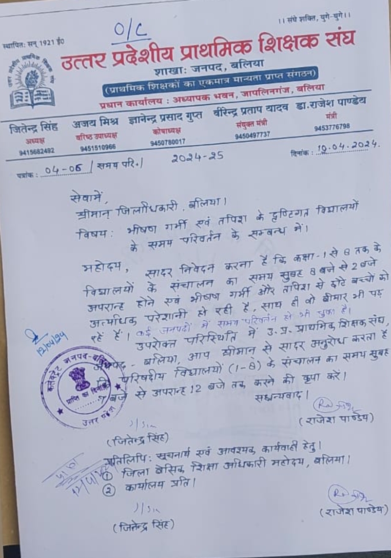 बलिया। उत्तर प्रदेशीय प्राथमिक शिक्षक संघ ने जिलाधिकारी को पत्र लिखकर विद्यालय संचालन का समय 7.30 से 12.30 करने की मांग। हीटवेभ और कड़कड़ाती धूप से परेशान हो जा रहे हैं बच्चे,नहीं मिल रही है उन्हें राहत,बच्वे 12 बजे के बाद परेशान हो जा रहे हैं।
