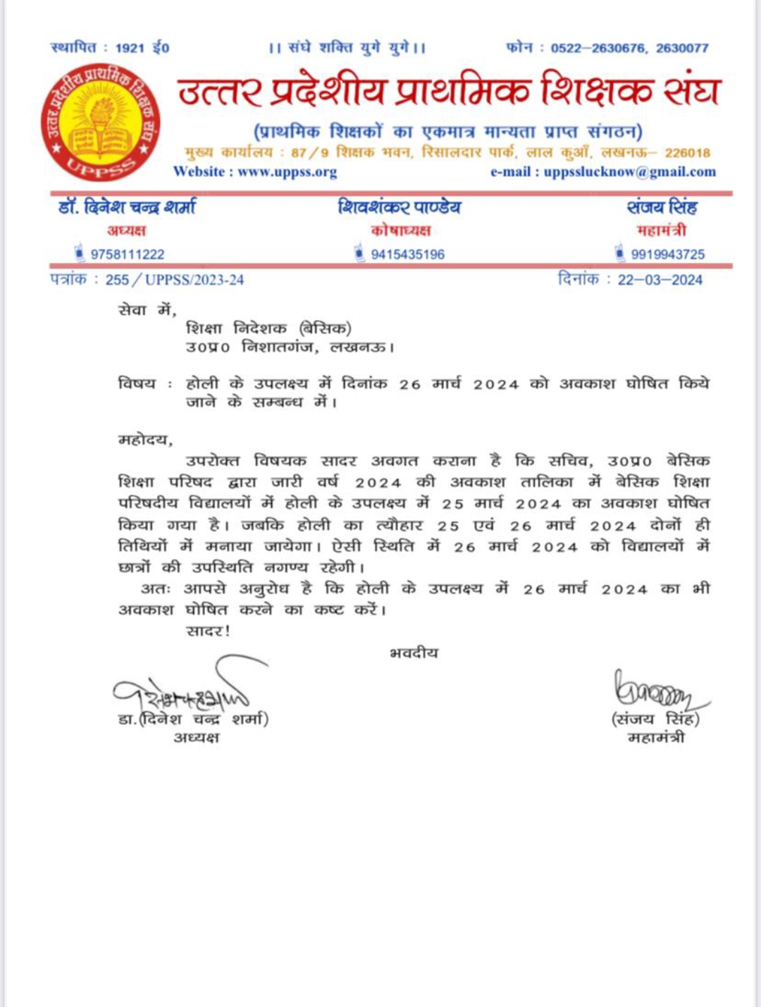 : होली 25 और 26 मार्च को लेकिन अवकाश 26 को नहीं,डा० दिनेश चन्द्र शर्मा ने किया26 को आवकाश देने की मांग