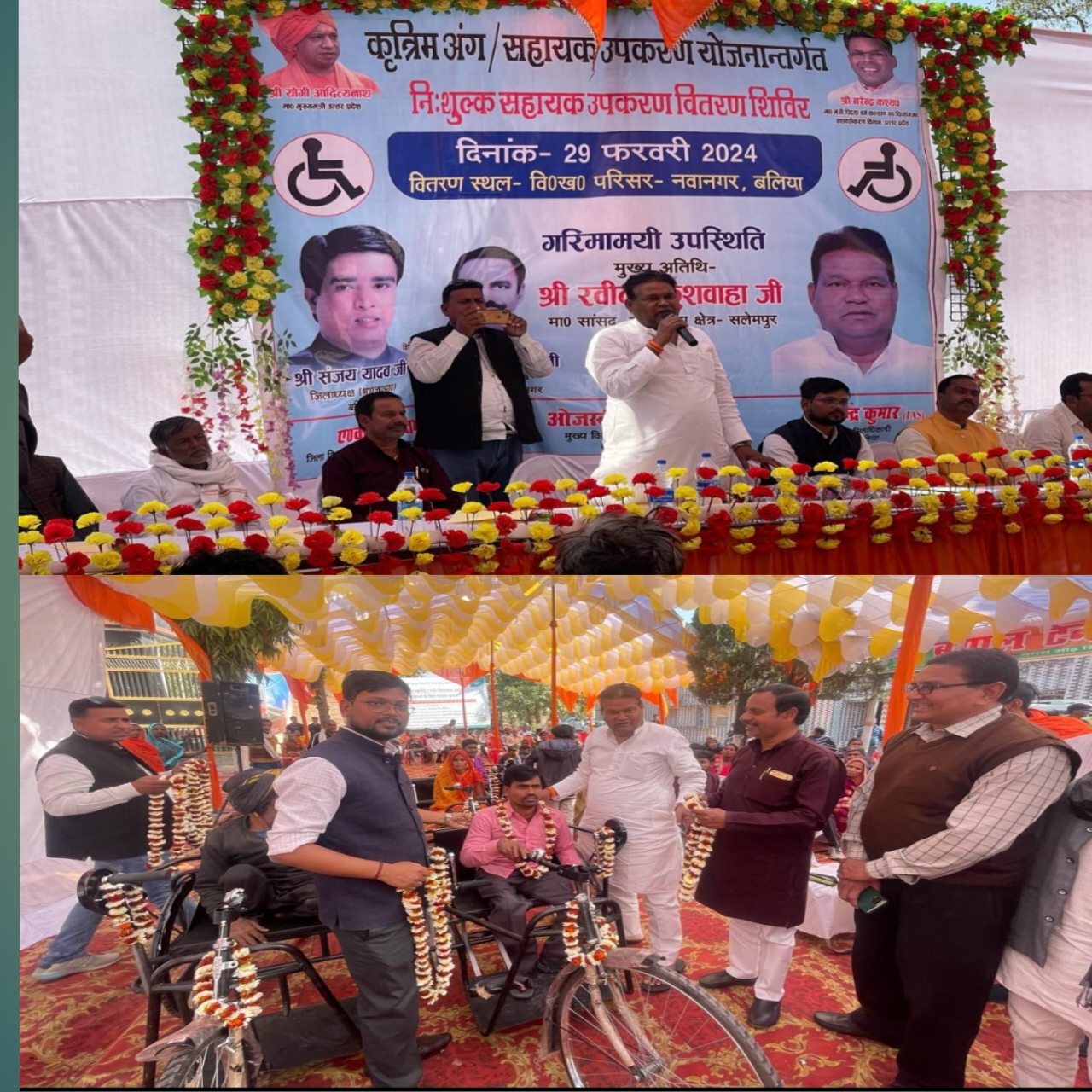बलिया: नवानगर ब्लॉक परिसर में दिव्यांगजन सशक्तीकरण विभाग, बलिया की ओर से आयोजित कृत्रिम अंग / सहायक उपकरण वितरण कार्यकम हुआ। इसमें सांसद सलेमपुर रवीन्द्र कुशवाहा ने दिव्यांगजनों को सहायक उपकरण वितरित किया। उन्होंने कहा कि दिव्यांगता कोई अभिशाप नही है, इसलिए अपने मन मे हीन भावना नही लानी चाहिए। दिव्यांगता कोई कमी नही है, इसलिए पूरी क्षमता एवं अपनी प्रतिभा के साथ जीवन में सफलता के निरन्तर प्रयास करते रहना चाहिए। वितरण कार्यकम में 41 ट्राईसाईकिल, 04 कान की मशीन एवं स्मार्ट केन का वितरण दिव्यांगजनों में किया गया। कार्यक्रम में ब्लाक प्रमुख नवानगर केशव चौधरी, जिला दिव्यांगजन सशक्तीकरण अधिकारी अशोक कुमार गौतम, बीडीओ देवेन्द्र प्रताप वर्मा आदि मौजूद थे।