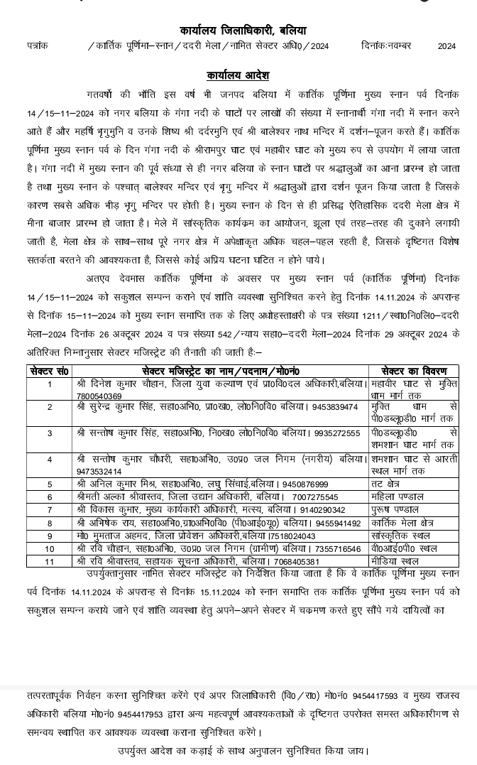 बलिया। 14/15 नवम्बर 2024 कार्तिक पूर्णिमा स्नान पर्व के दृष्टीगत जनपद बलिया शहर क्षेत्र में लाखों की संख्या में स्नानार्थियों द्वारा गंगा नदी में स्नान व महर्षि भृगु मुनि, दर्दर मुनि तथा श्री बालेश्वरनाथ जी का दर्शन पूजन किया जाता है, उक्त पर्व पर श्रद्धालुओँ की भारी भीड़ को देखते हुए पर्व को सकुशल सम्पन्न कराने के दृष्टिगत पार्किंग/बैरियर प्वाइंट/रूट डायवर्जन निम्नवत है-**नो एण्ट्री/ डायवर्जन**1.दुबहड़ –* बैरिया की तरफ से आने वाले भारी वाहनों को थाना दुबहड़ के पास दिनांक 14.11.2024 को प्रातः 08.00 बजे से दिनांक 15.11.2024 को समय 24.00 बजे तक रोका जायेगा । यदि वाहन नरहीं व फेफना की तरफ जाना चाहते हैं, तो चिरैया मोड़ से सहतवार, बाँसडीह ,सुखपुरा, होते हुए गडंवार(त्रिकालपुर तिराहा) से फेफना व नरहीं जायेगे ।*2.शंकरपुर तिराहा बाँसडीह रोड -* रेवती, सहतवार, बाँसडीह की तरफ से आने वाले भारी वाहन को थाना बाँसडीह रोड के पास दिनांक 14.11.2024 को प्रातः 08.00 बजे से दिनांक 15.11.2024 को समय 24.00 बजे तक रोका जायेगा । यदि वाहन नरही, रसड़ा व फेफना की तरफ जाना चाहते हैं, तो सुखपुरा, गड़वार(त्रिकालपुर तिराहा) होते हुए फेफना,नरहीं जायेंगे ।*3.हनुमानगंज-* सिकन्दरपुर से आने वाले भारी वाहनों को हनुमानगंज चौकी के पास दिनांक 14.11.2024 को प्रातः 08.00 बजे से दिनांक 15.11.2024 को समय 24.00 बजे तक रोका जायेगा । यदि सिकन्दरपुर से आने वाले वाहन दुबहड़ हल्दी बैरिया जाना चाहते है, तो सुखपुरा बाँसडीह सहतवार होते हुए जायेगें तथा यदि वाहन नरहीं व फेफना की तरफ जाना चाहते हैं तो सुखपुरा,गडंवार (त्रिकालपुर तिराहा) से होते हुए फेफना व नरहीं जायेगे।*4.फेफना तिराहा-* रसड़ा व नरहीं की तरफ से आने वाले भारी वाहनों को फेफना तिराहा के पास दिनांक 14.11.2024 को प्रातः 08.00 बजे से दिनांक 15.11.2024 को समय 24.00 बजे तक रोका जायेगा । यदि वाहन बैरिया की तरफ जाना चाहते हैं तो गड़वार(त्रिकालपुर तिराहा) से सुखपुरा, बाँसडीह, सहतवार होते हुए जायेगें ।*5.अगरसण्डा-* गड़वार की तरफ से आने वाले भारी वाहनों को अगरसण्डा के पास दिनांक 14.11.2024 को प्रातः 08.00 बजे से दिनांक 15.11.2024 को समय 24.00 बजे तक रोका जायेगा । यदि वाहन हल्दी, बैरिया की तरफ जाना चाहते हैं तो गड़वार(त्रिकालपुर तिराहा) से सुखपुरा, बाँसडीह, सहतवार होते हुए जायेगें ।
