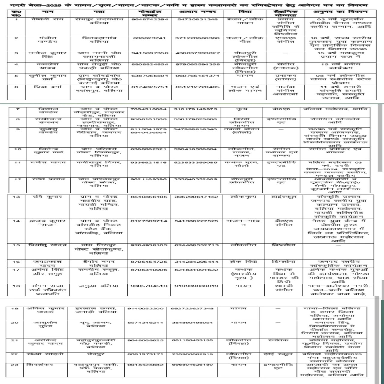 बलिया। ददरी मेला-2025 के गायन/नृत्य/वादन/नाटक/कवि व हास्य कलाकारो द्वारा ददरी मेला के सांस्कृतिक मंच/भारतेन्दु मंच पर अपनी प्रस्तुति देने हेतु अपनीसहमति दी है।
