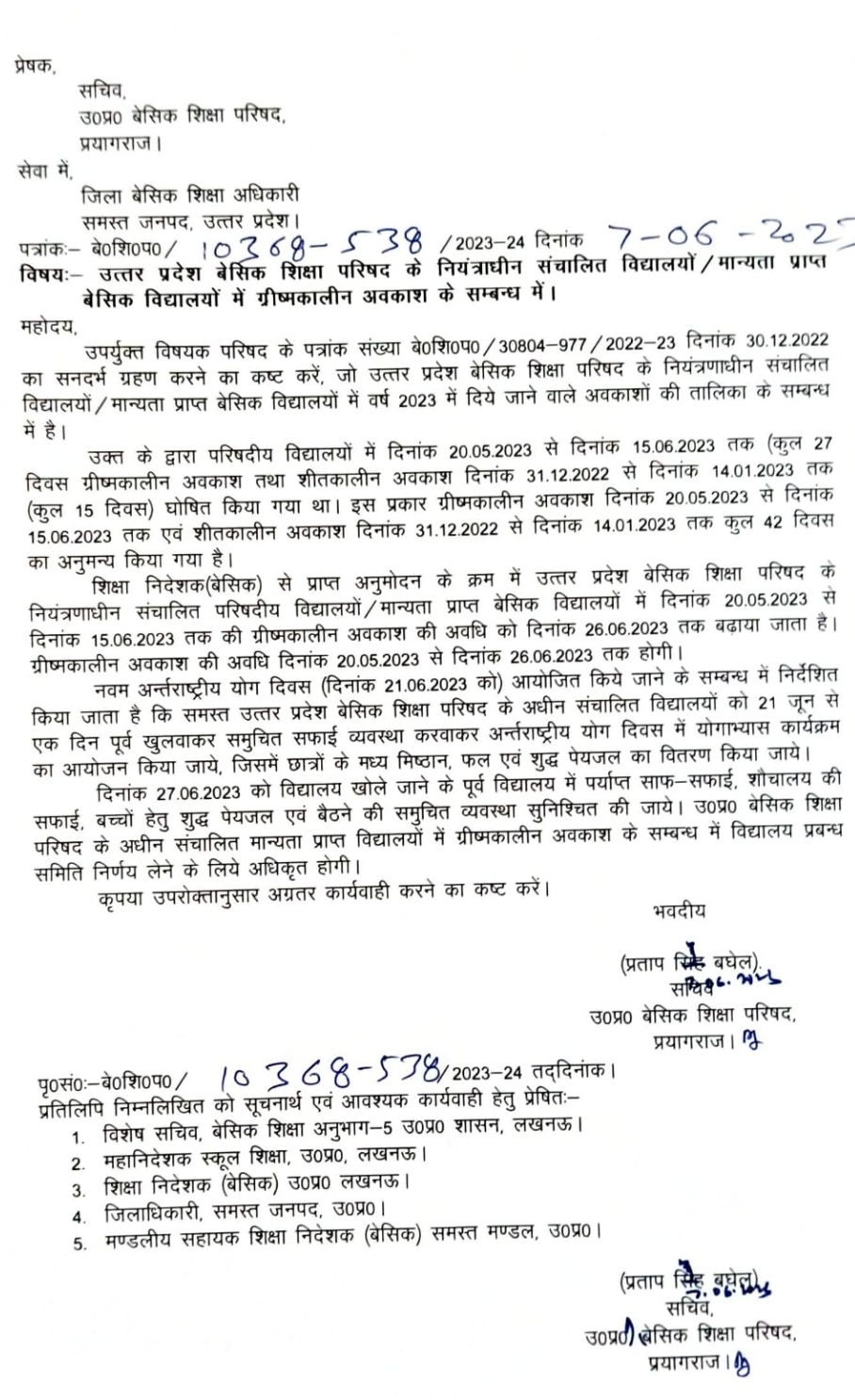 बलिया।उत्तर प्रदेश बेसिक शिक्षा परिषद के अन्तर्गत संचालित परिषदीय व मान्यता प्राप्त विद्यालय अब 27 जून को खुलेंगे पहले निर्धारित अवकाश तालिका के अनुसार ग्रीष्मावकाश 15 जून तक ही था।सचिव बेसिक शिक्षा परिषद ने अपने पत्र दिनांक07 जून के अनुसार इस अवकाश को बढ़ाकर अब 26 जून कर दिया है।